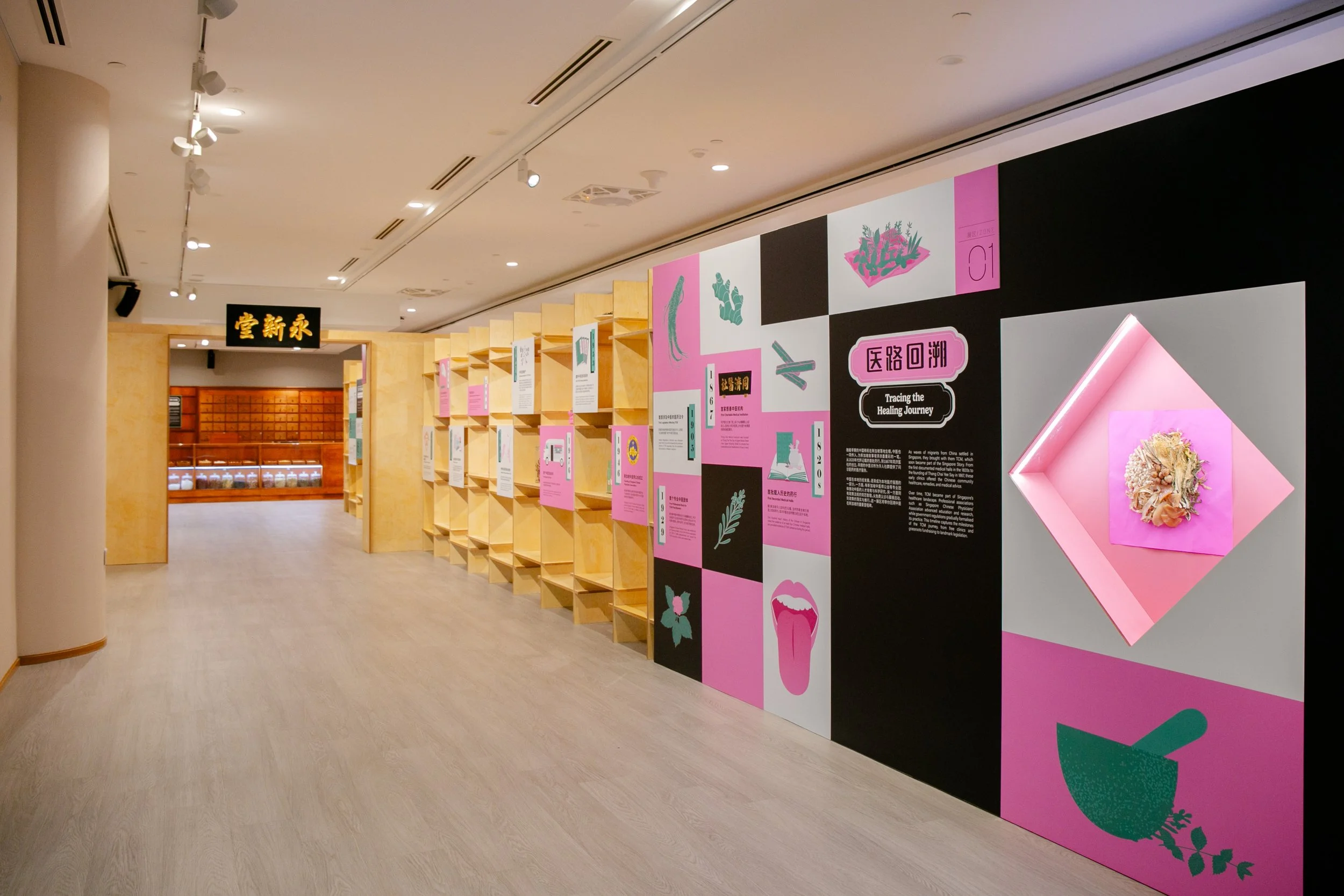 The exhibition title, 'Healing Heritage,' inspired a core motif: the two 'H's intertwine to symbolise the interconnected philosophy of Traditional Chinese Medicine (TCM) and the organised structure of the Bai Zi Gui.